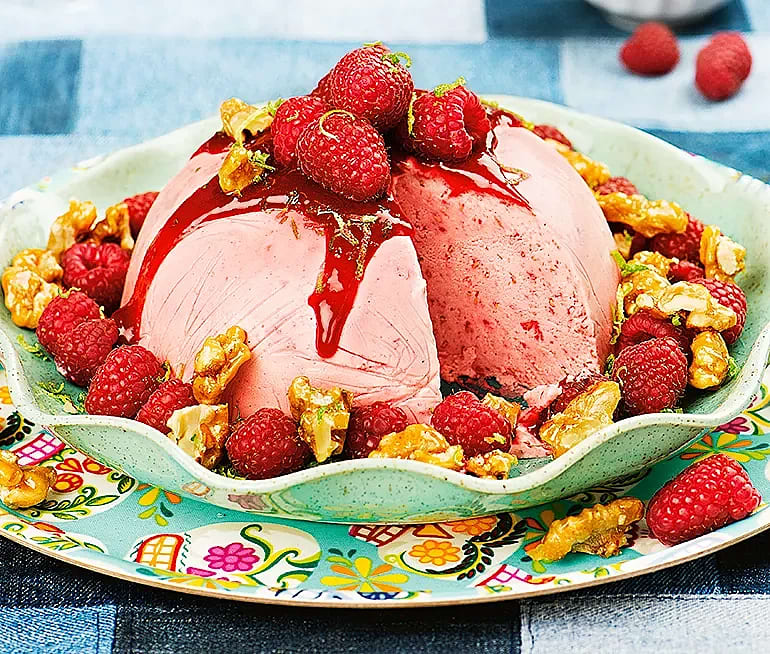 Hallon- och limeparfait med kanderade valnötter