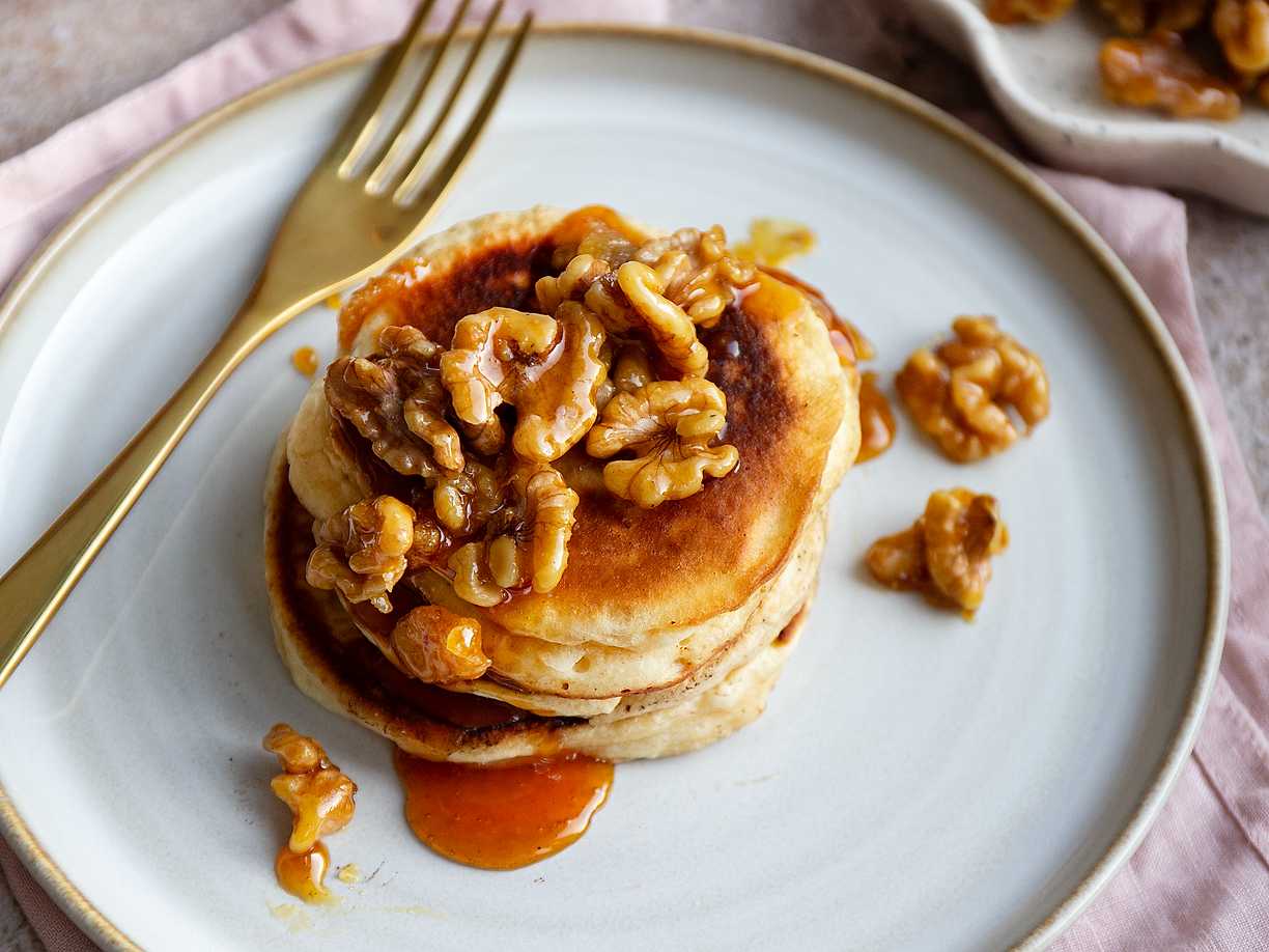 Amerikanska pannkakor med karamelliserade valnötter