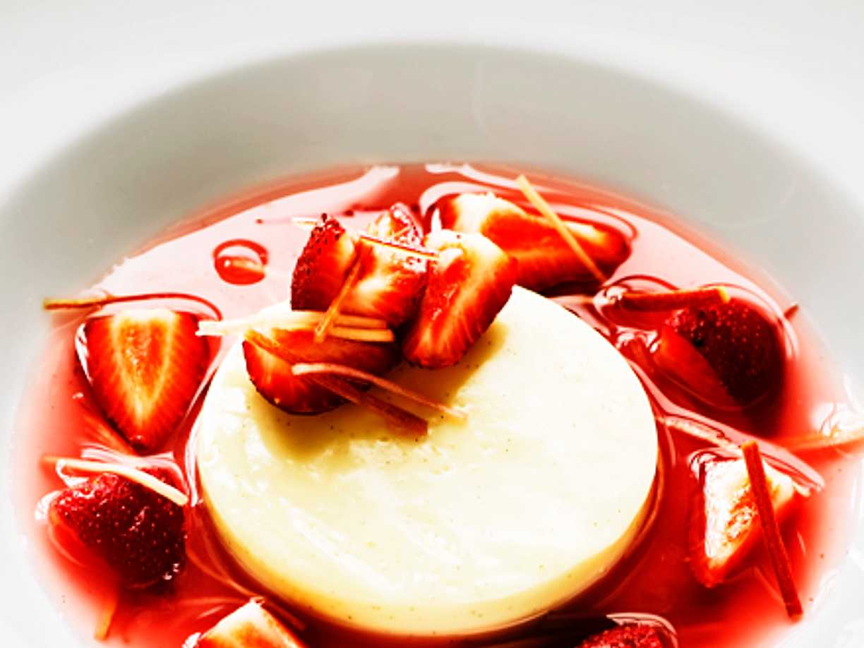 Rabarber- och jordgubbssoppa med vaniljpannacotta