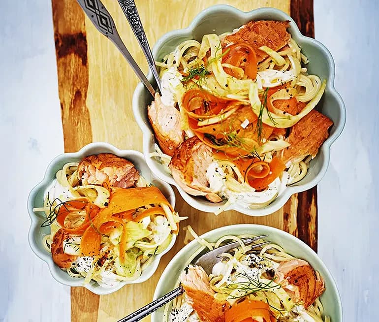 Carbonara med varmrökt lax och fänkålssallad