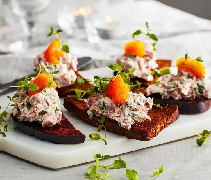 Varmrökt lammfiol på crostini av kavring med örter och löjrom