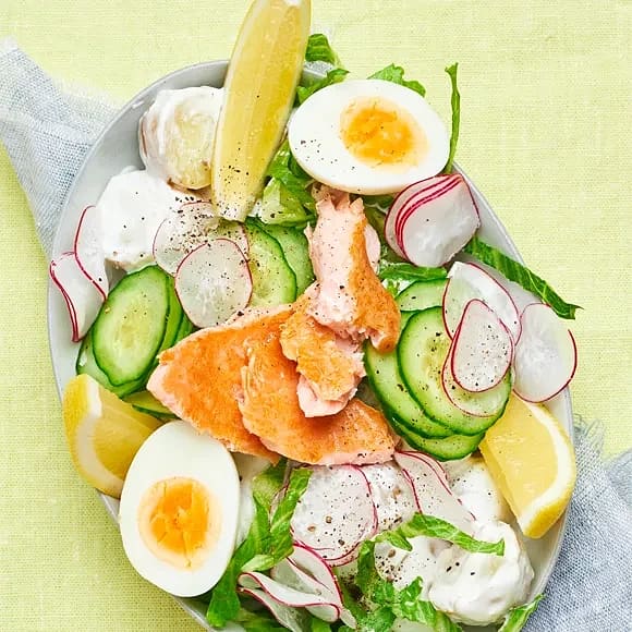 Sallad med varmrökt lax och ägg