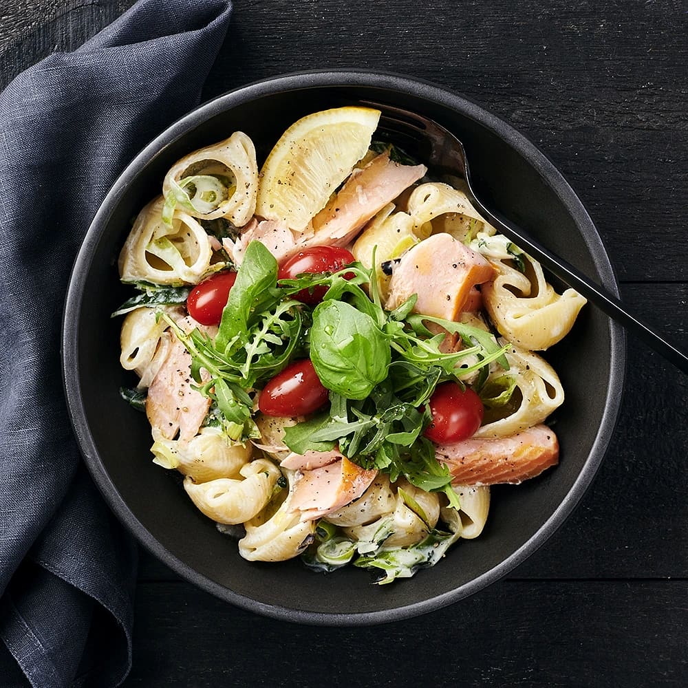 Krämig purjopasta med varmrökt lax
