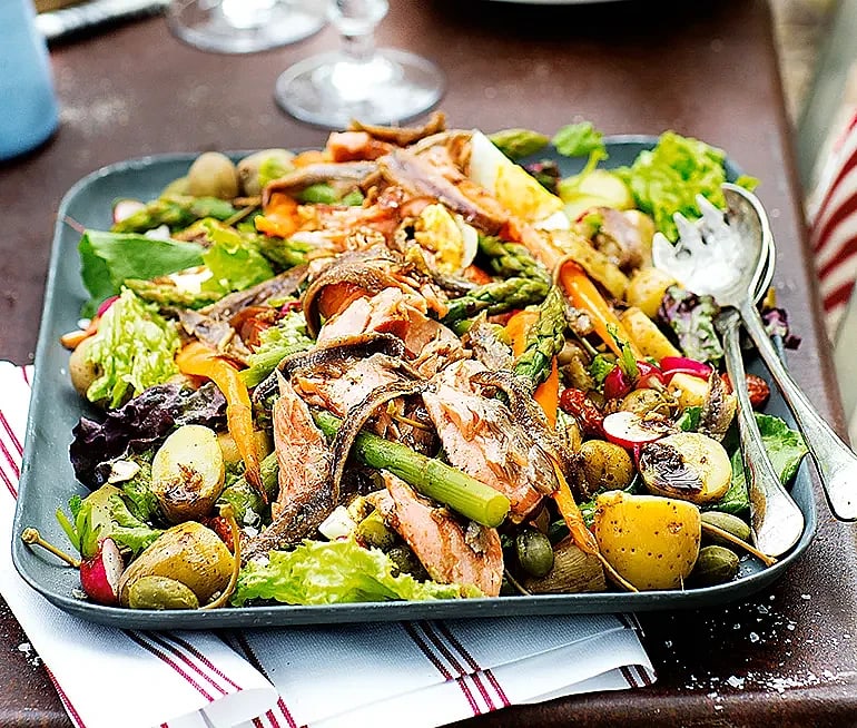 Sommarsallad med varmrökt fisk