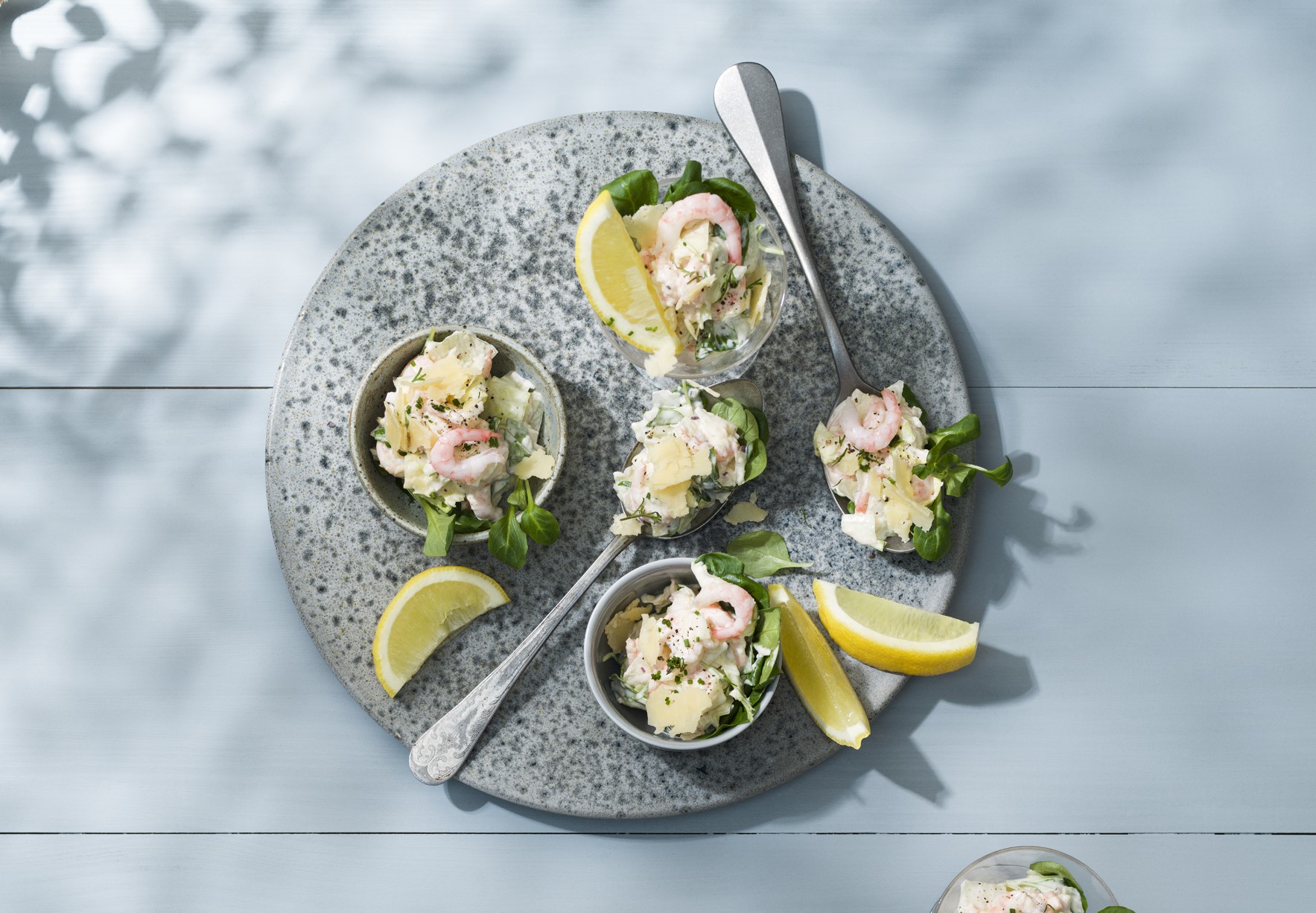 Langos med citronmarinerad rödlök, räkor, västerbottensost och löjrom