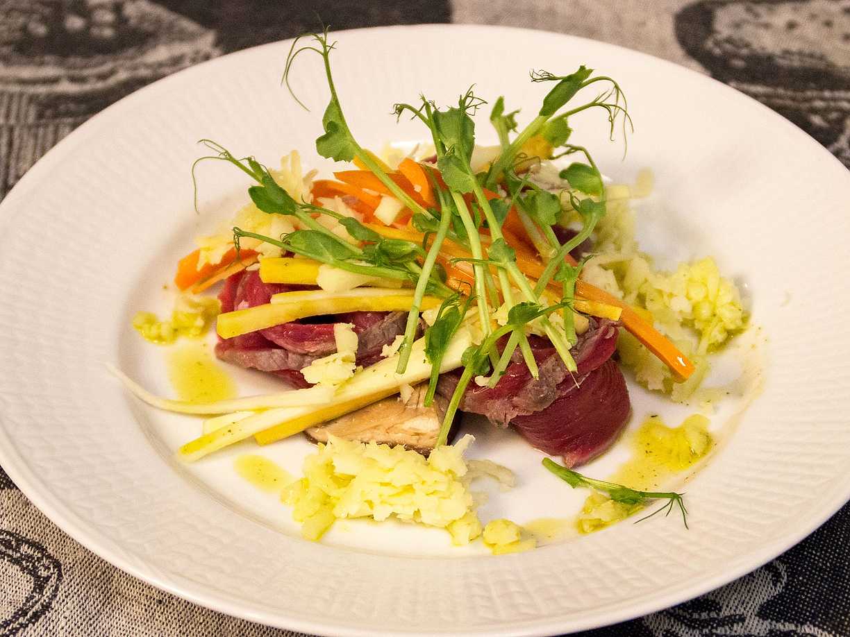Carpaccio på älg med västerbottensost och pickles på svenska