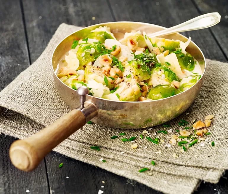 Bräserad brysselkål med Västerbottensost och hasselnötter