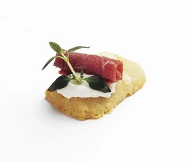 Knäckebrödspizza med ärtcrème, rökt skinka och västerbottensost.