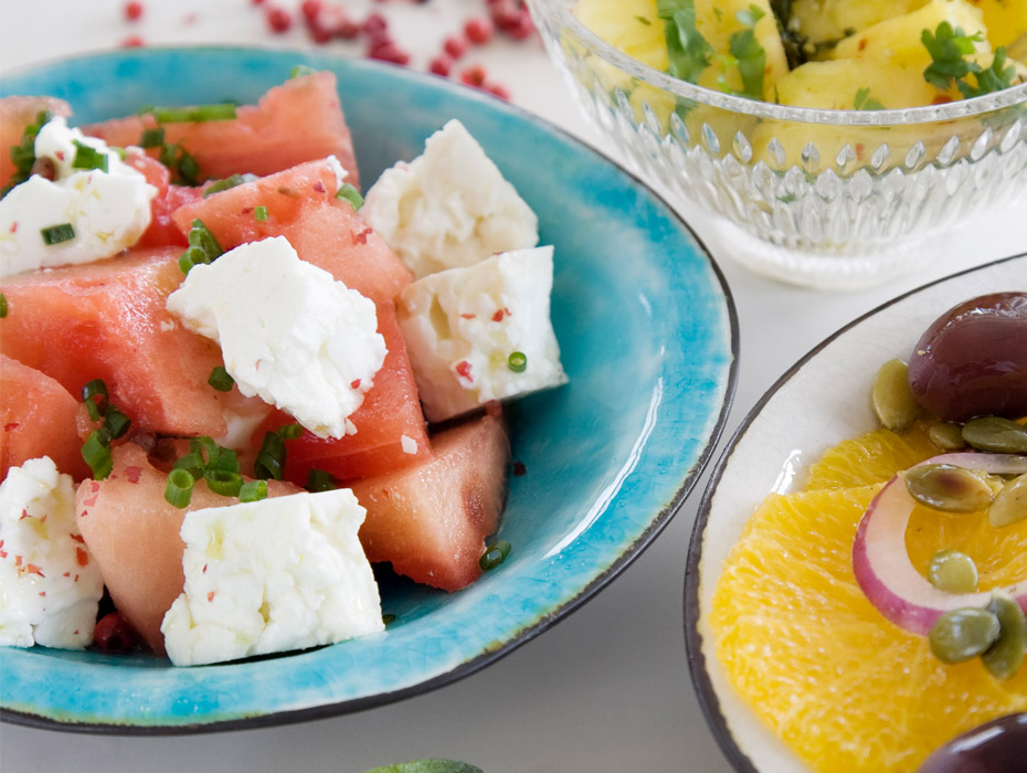 Sallad med vattenmelon, jordgubbar, oliver och grönpepparost