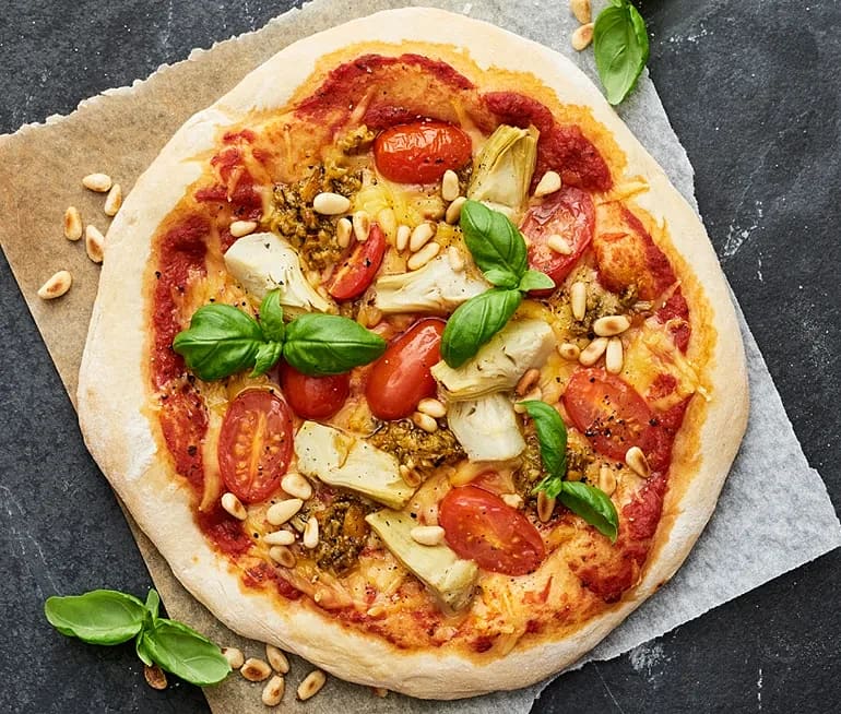 Vegansk pizza med tapenade, kronärtskocka och pinjenötter