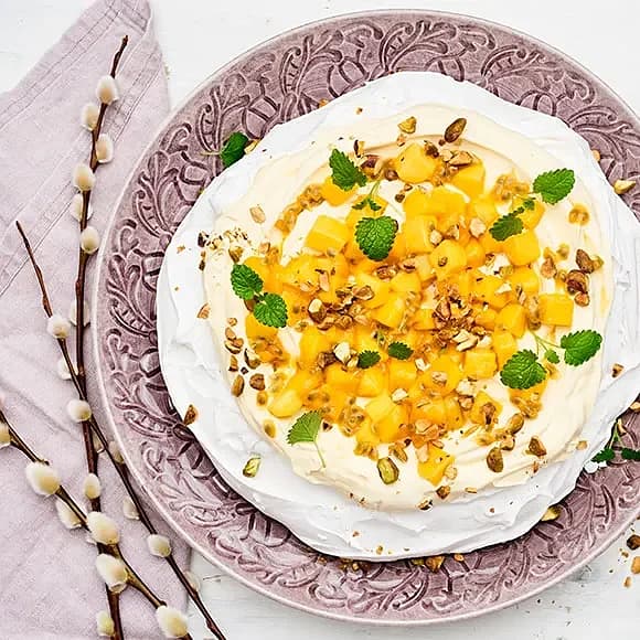 Vegansk pavlova med mango och passionsfrukt