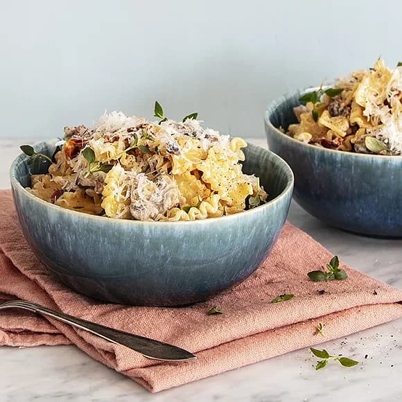 Krämig, vegansk carbonara med rökig svamp