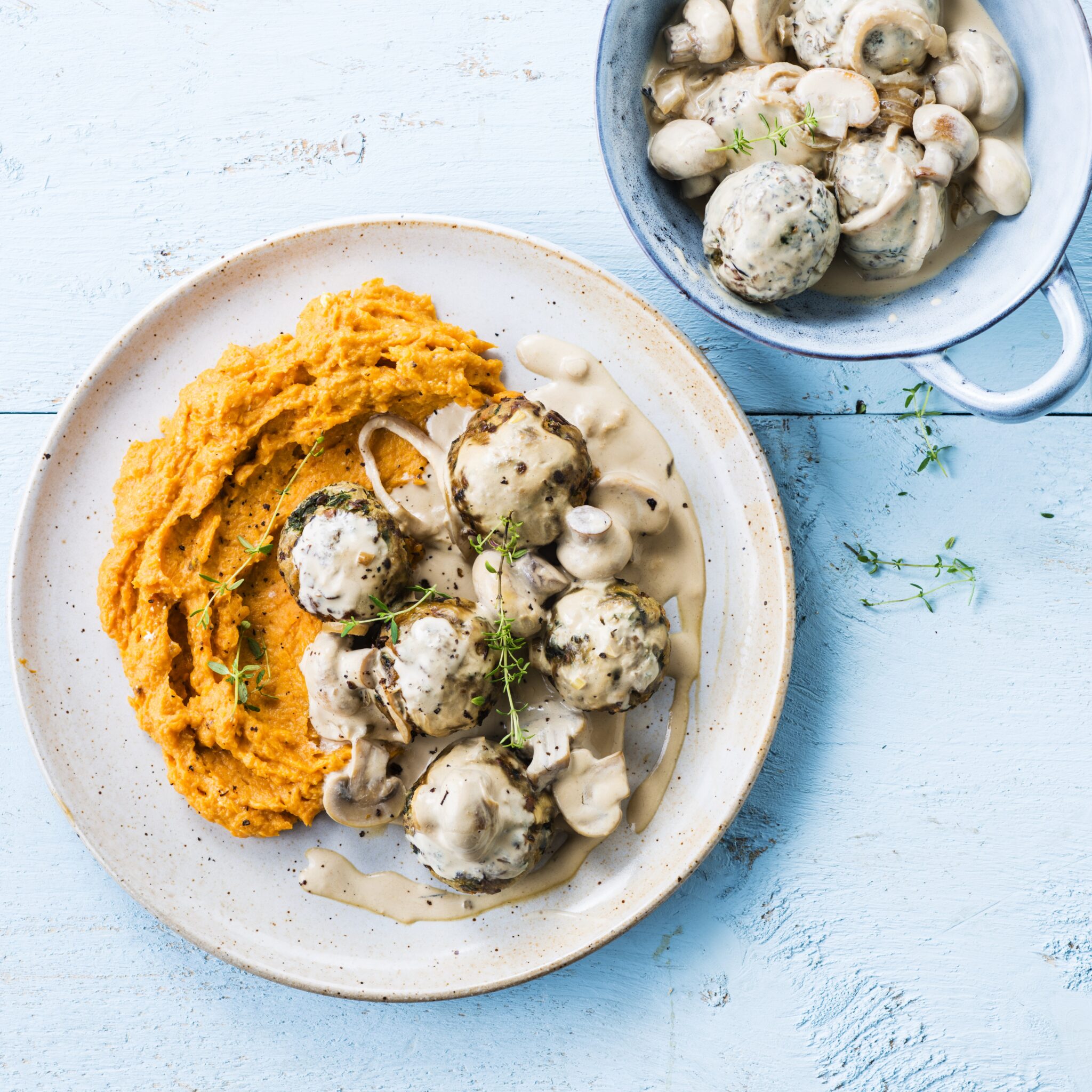 Vegetariska köttbullar med svampsås och sötpotatismos