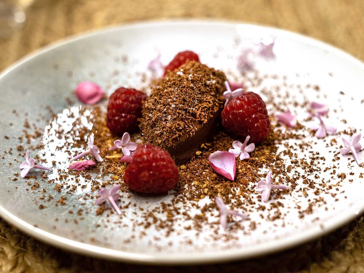 Vegansk chokladmousse med havssalt och misorostade hasselnötter