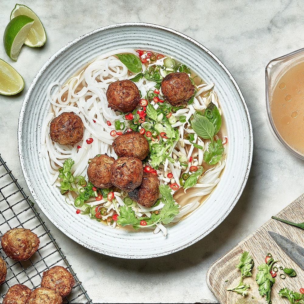 Vegansk pho soppa med bönbollar och koriander