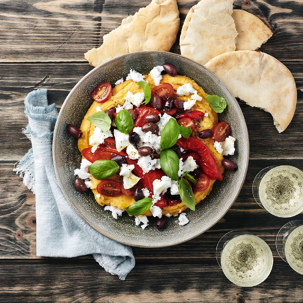 Sötpotatishummus med vegansk fetaost och rostad spetspaprika