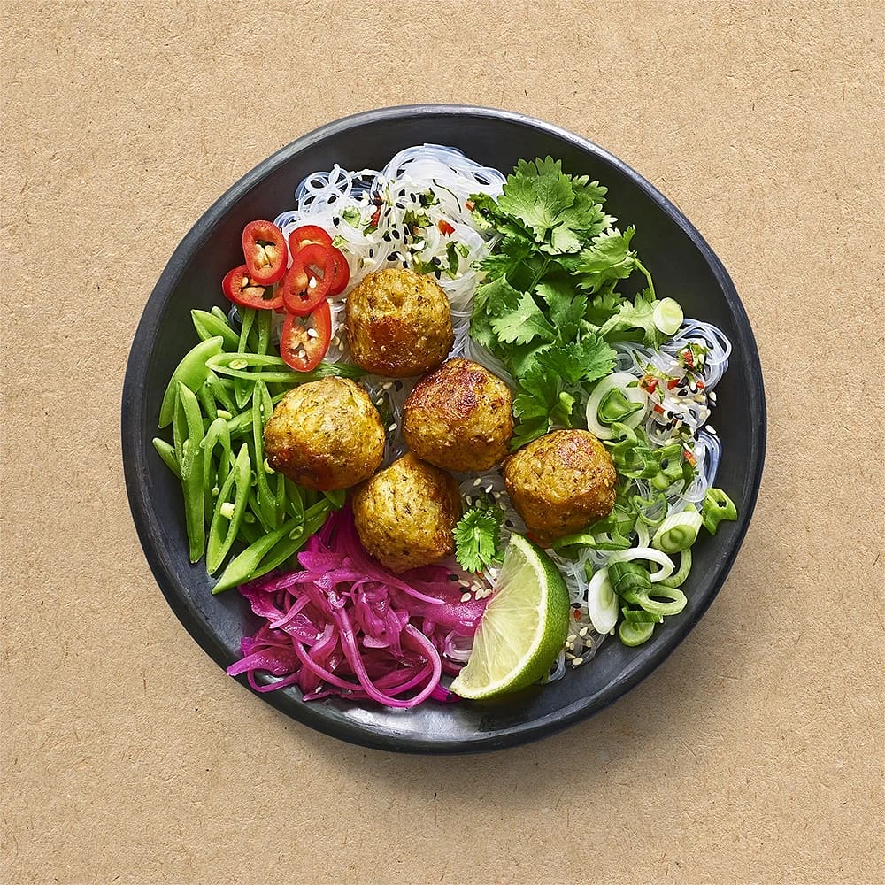 Vegetarisk poké bowl med bönbollar och snabbpicklad rödlök