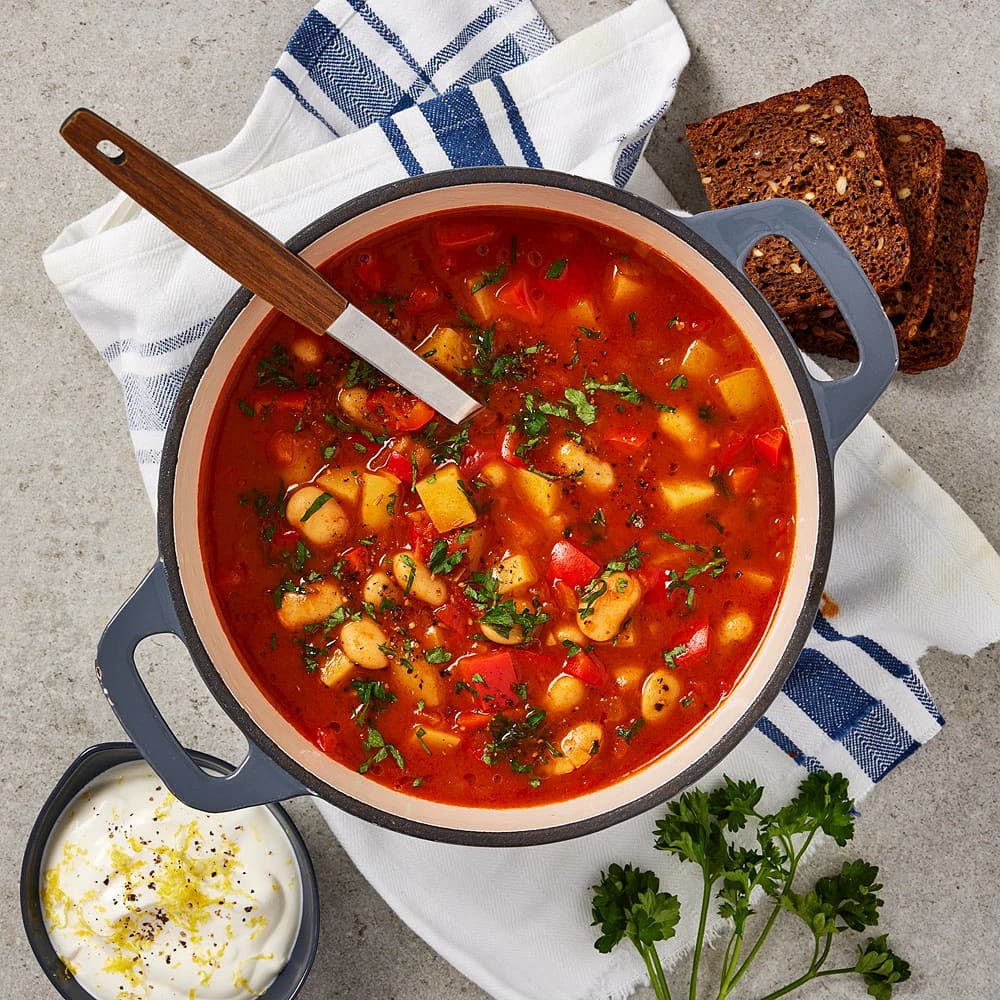Vegetarisk gulaschsoppa med gräddfil och saltgurka