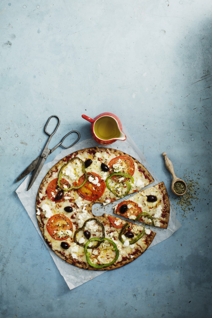 Vegetarisk pizza med pesto, mozzarella och pecorino