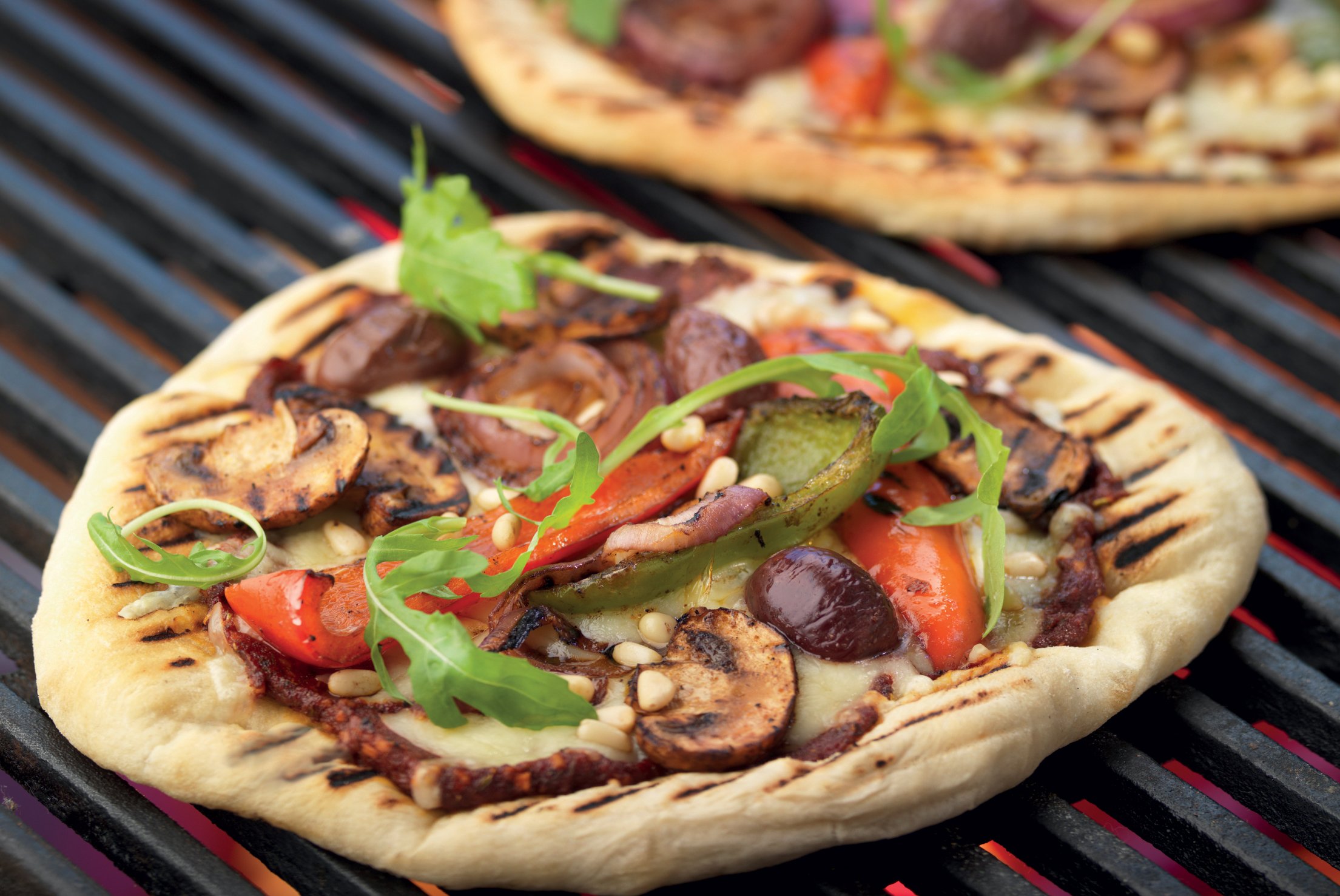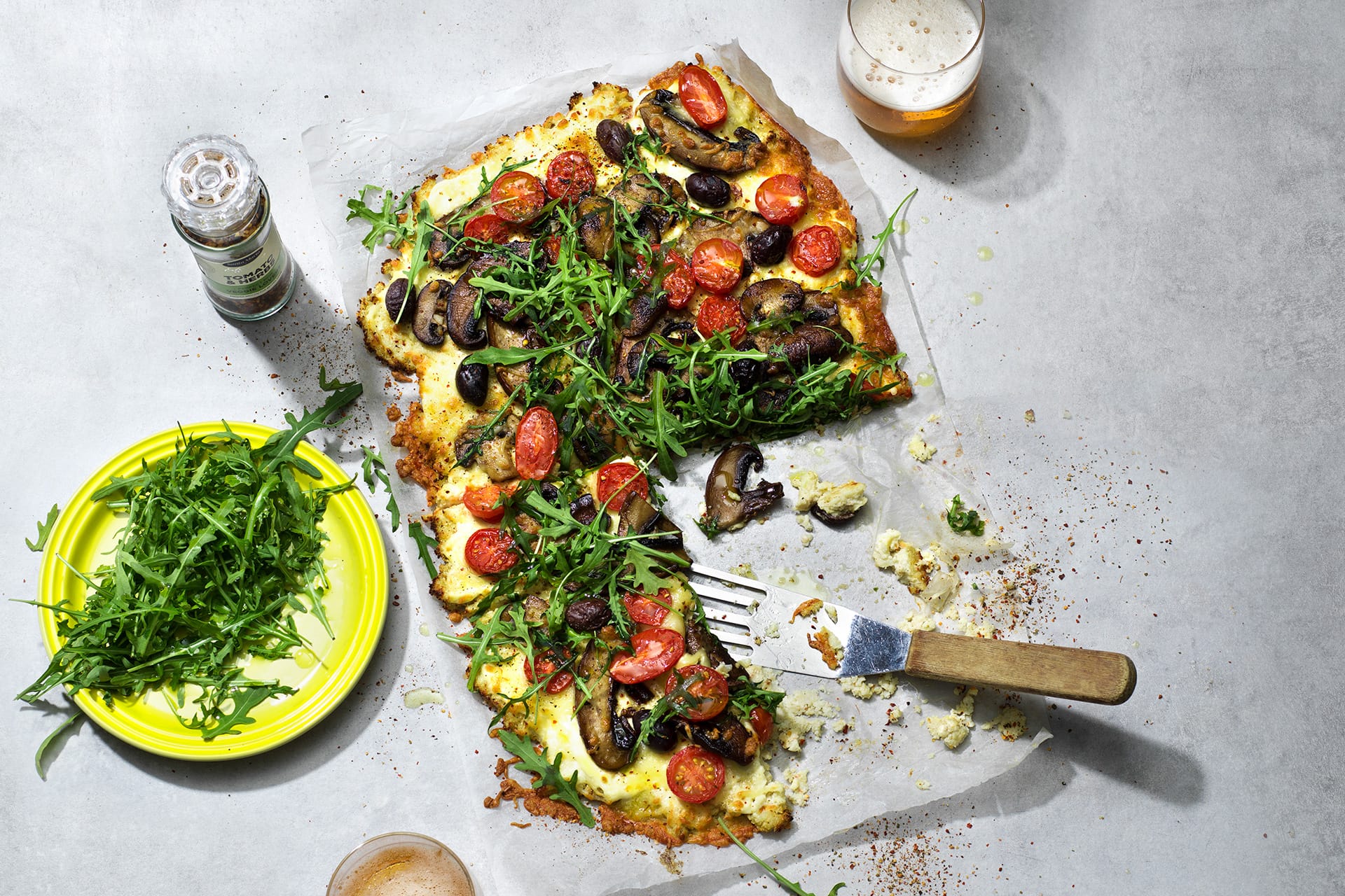 Vegetarisk pizza med champinjoner, oliver och pinjenötter