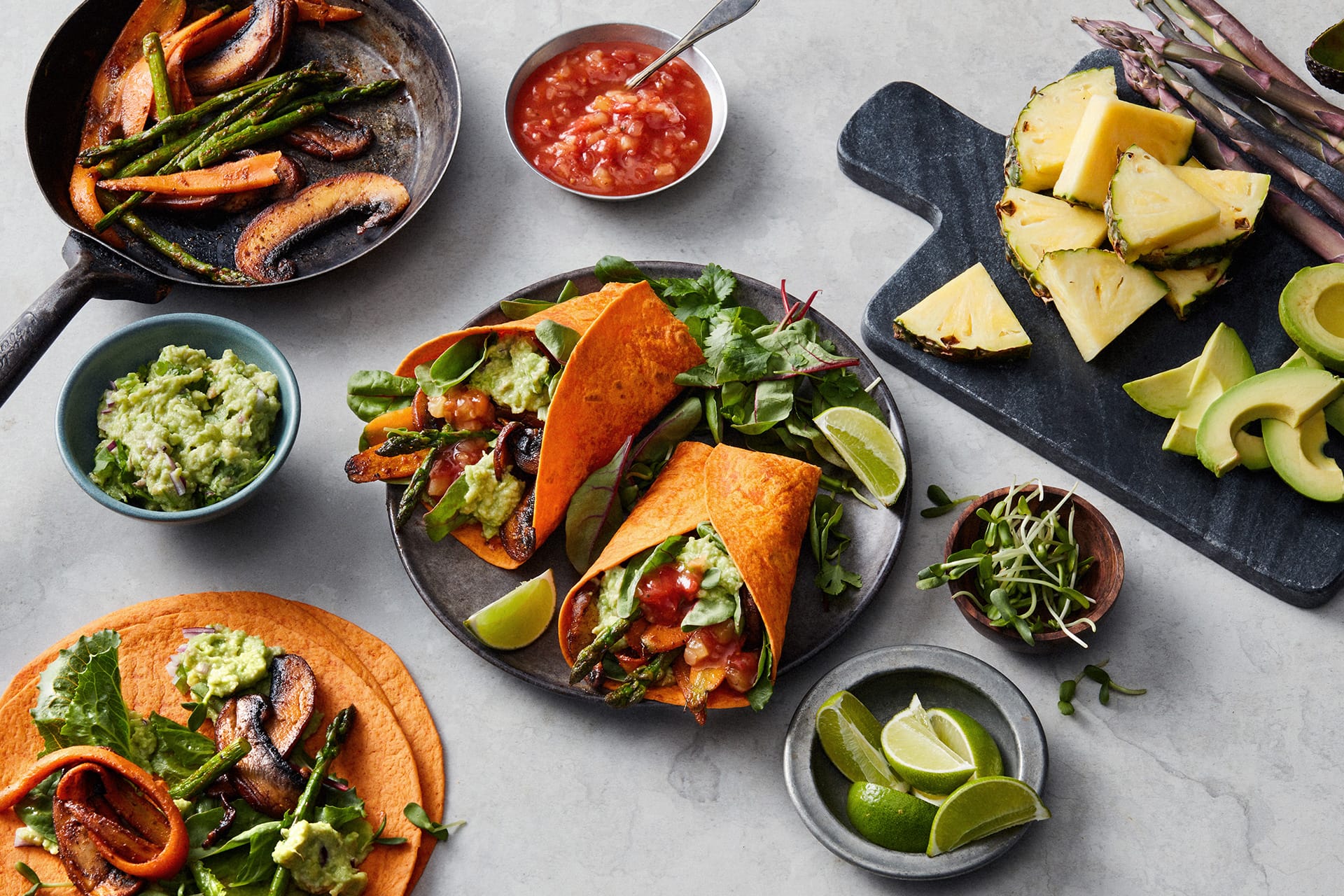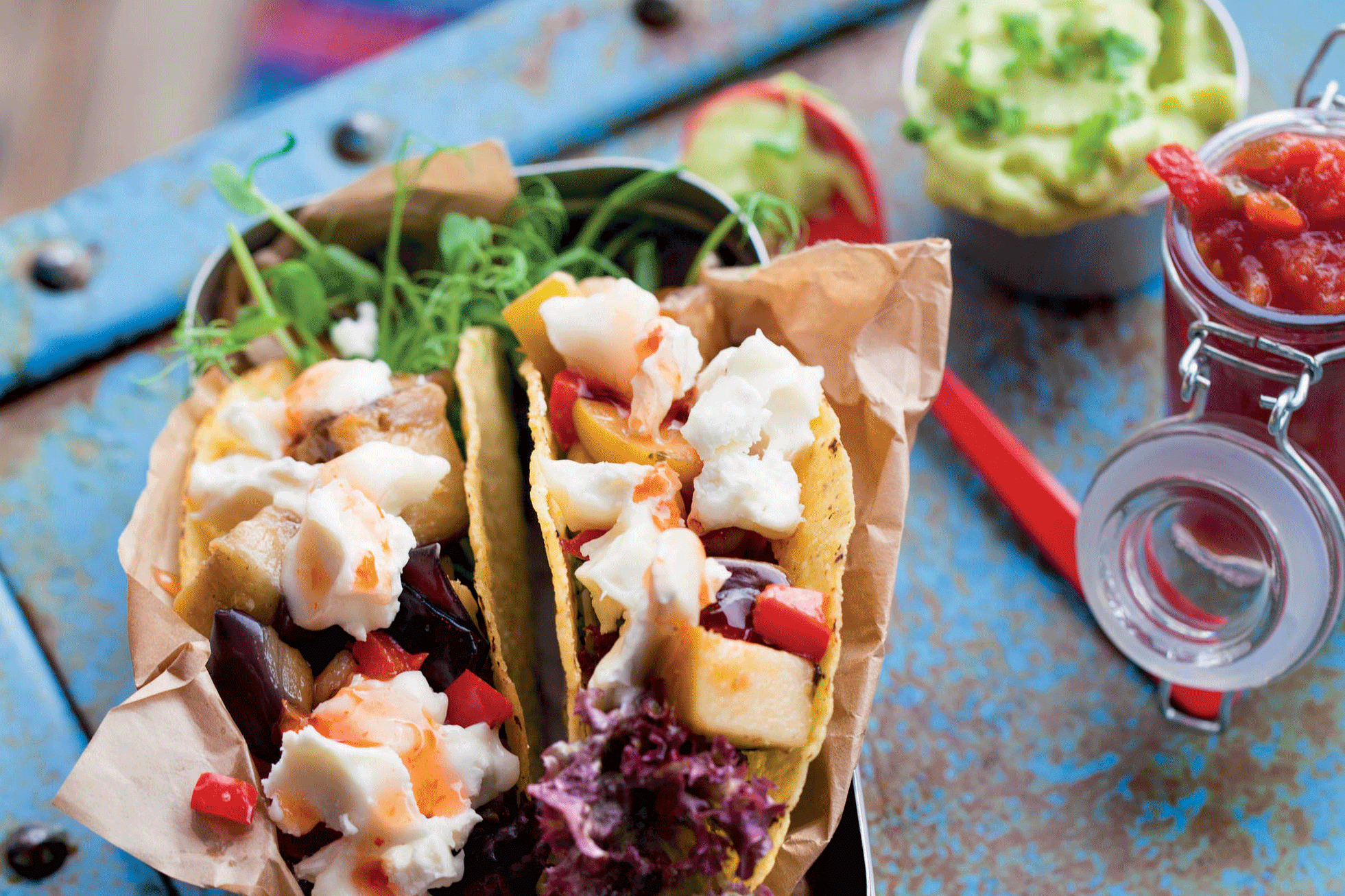 Vegetarisk taco med ärtguacamole och sötsyrlig rödkål