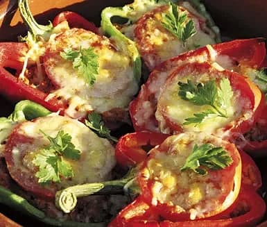 Ugnsgratinerade paprikor med vegetarisk färs