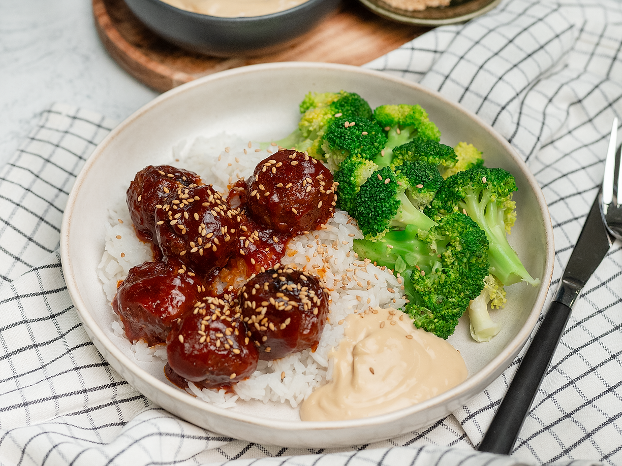 Asiatiska vegobullar i jordnötssås med äggnudlar