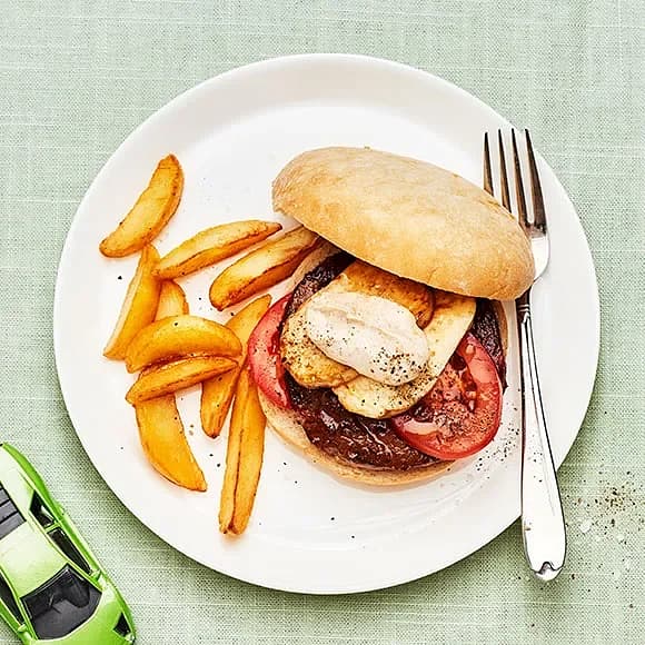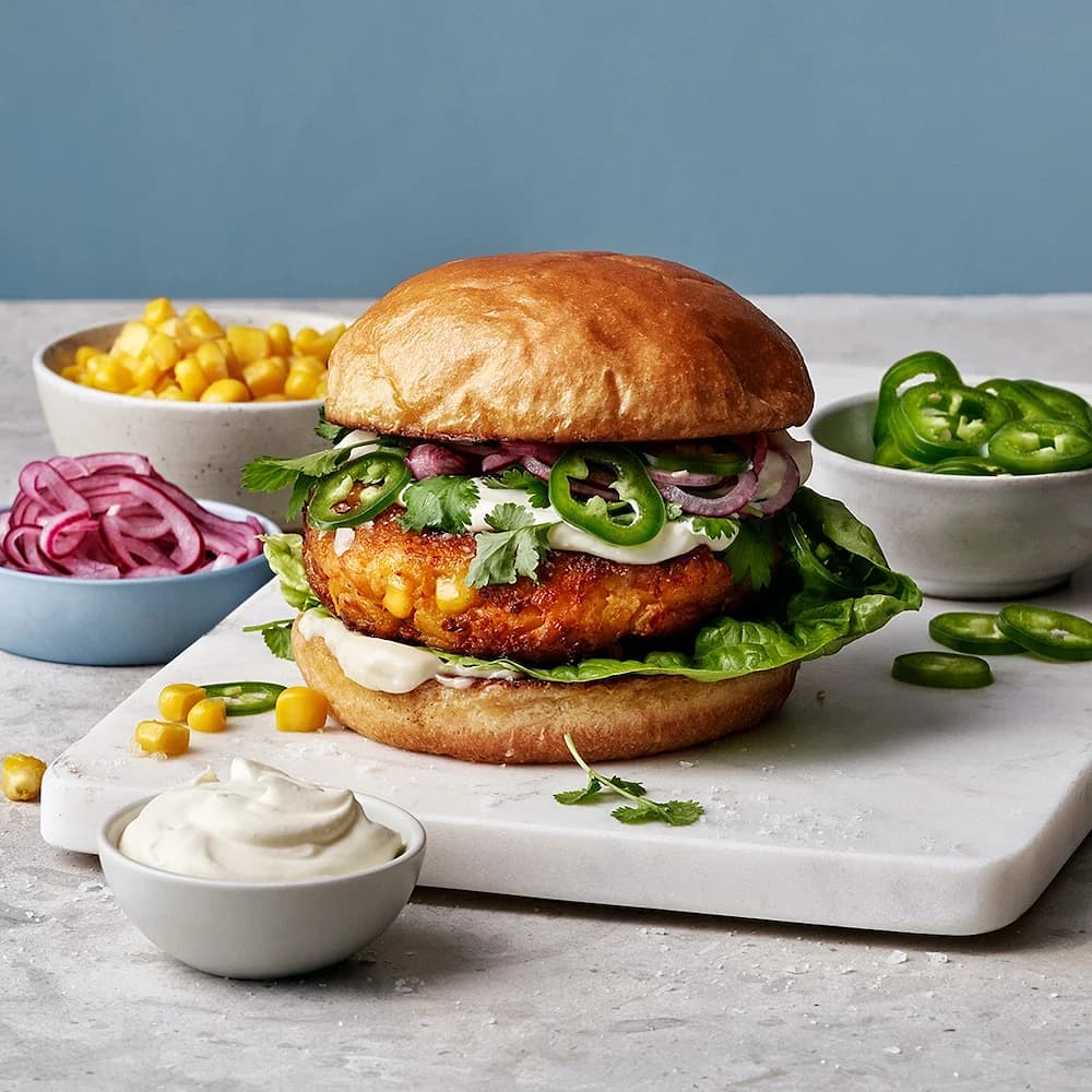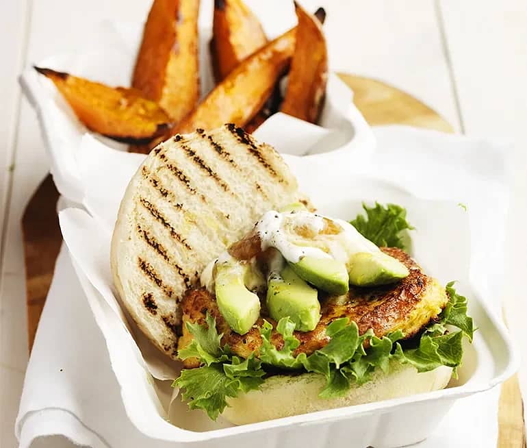 Vegoburgare med sötpotatispommes och tryffelmajo