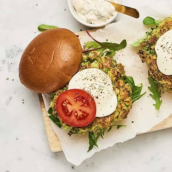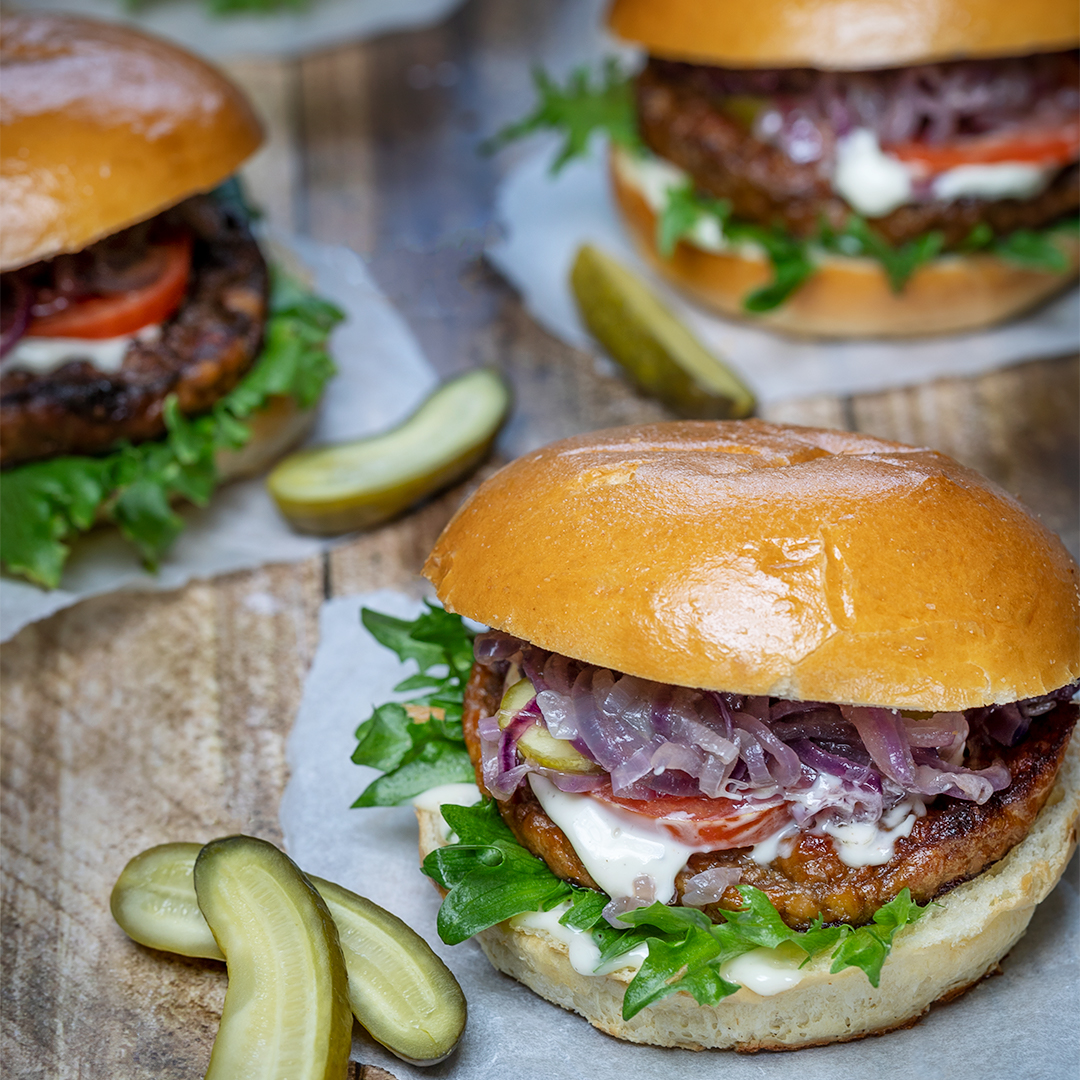 Vegoburgare med karamelliserad rödlök och tryffelmajonnäs