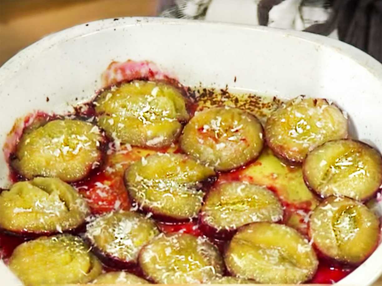 Bakade plommon med vit choklad, kokos, hasselnötter och mynta