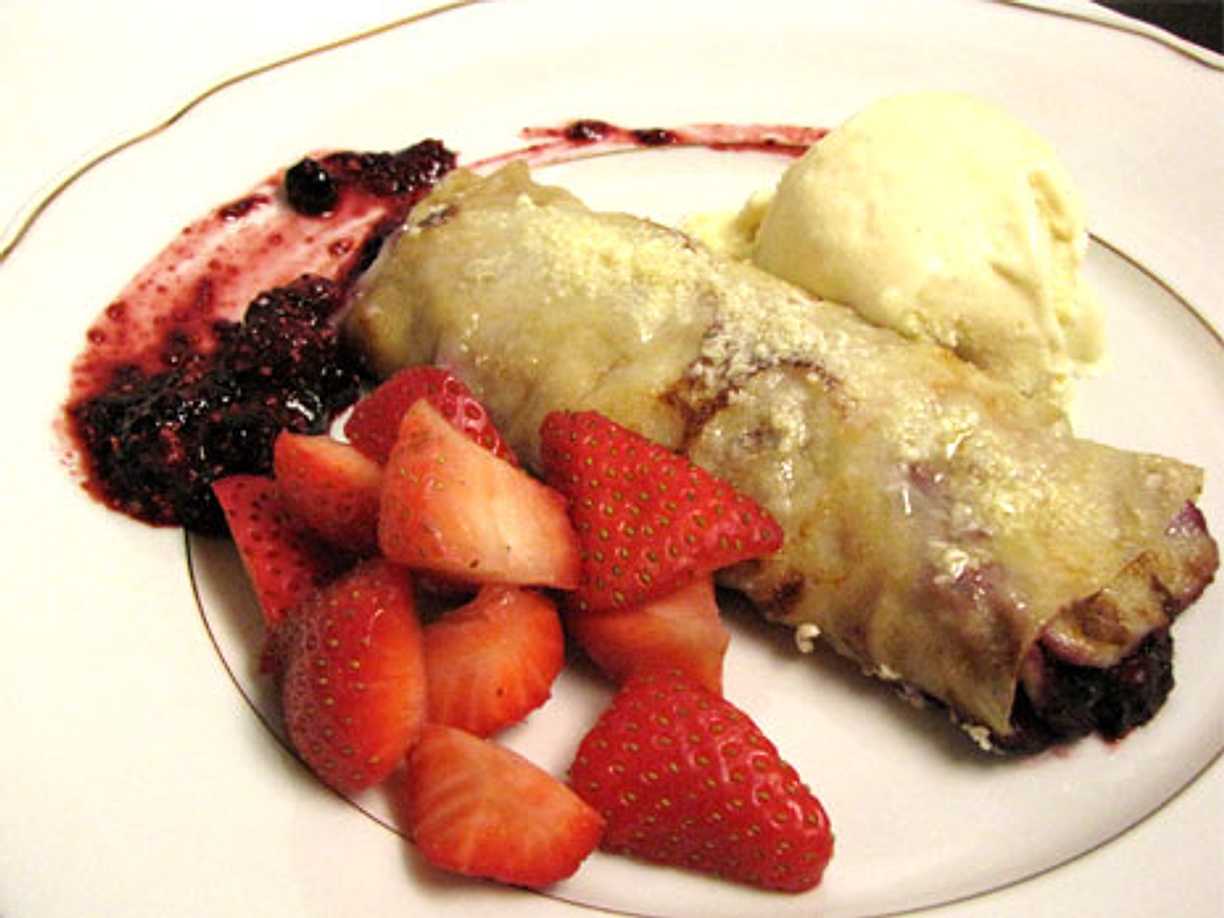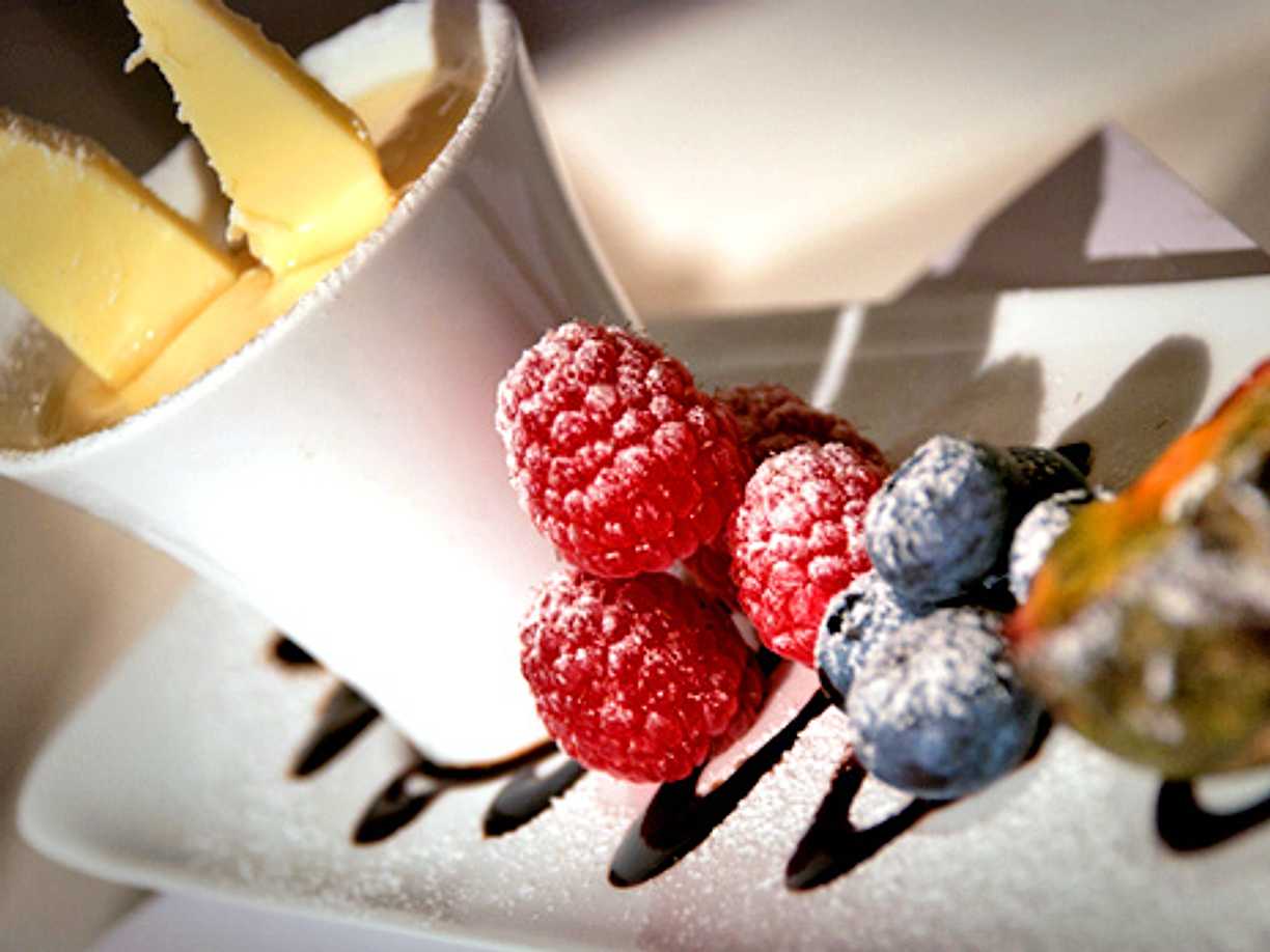 Chokladcrème med björnbär doppade i vit choklad och pistage