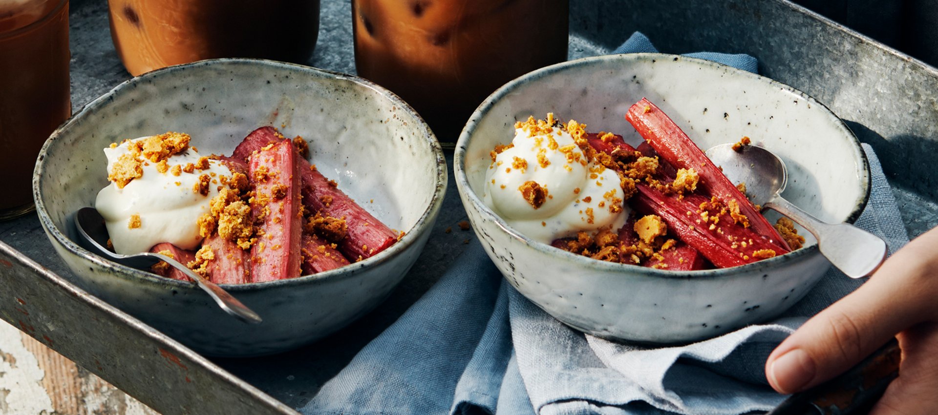 Grillade honungs- och vaniljrabarber med kardemummagrädde och grillad vit choklad