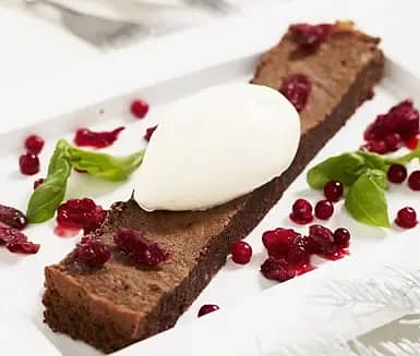 Tranbärschokladkaka med vit chokladmousse