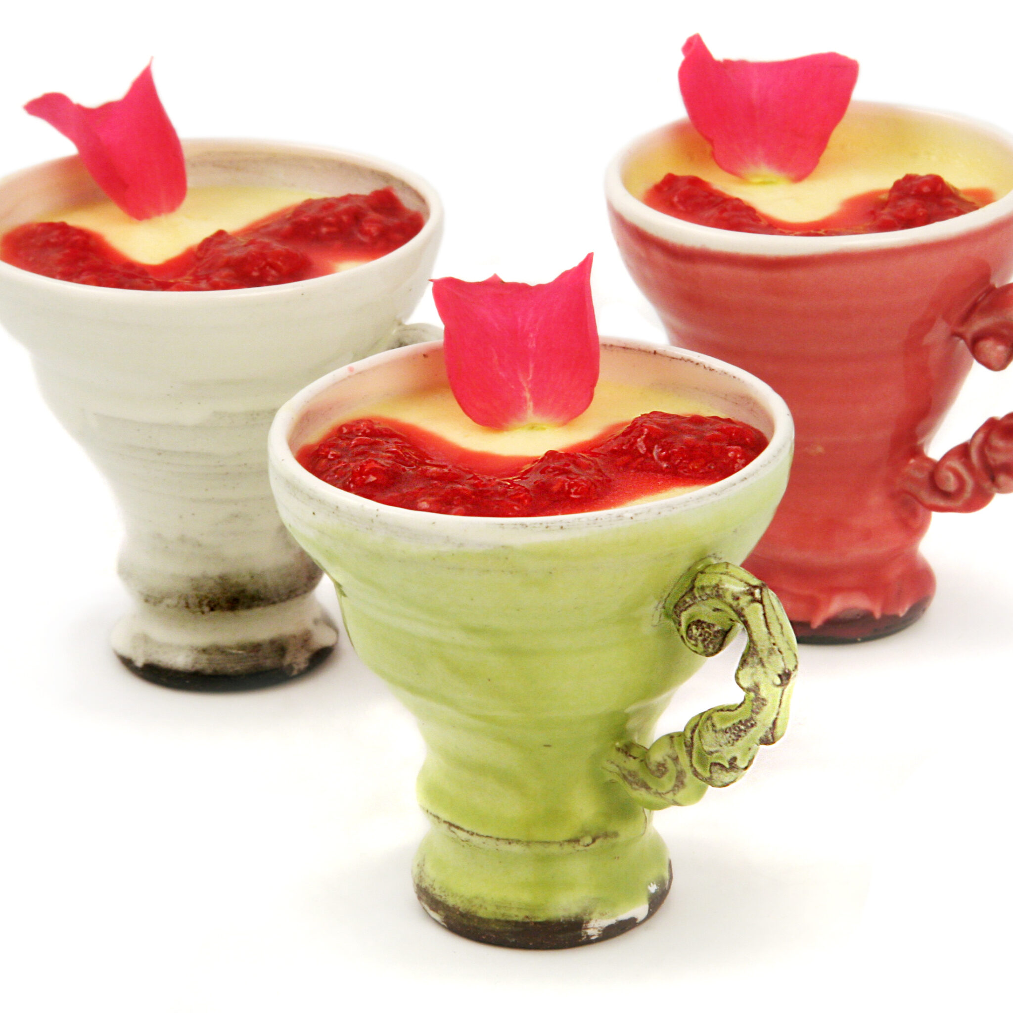 Vit chokladmousse i kopp med hallonmylta och rosenblad