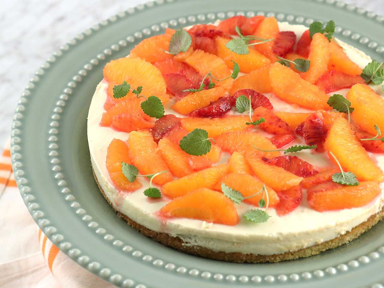 Pistagekaka med vit chokladmousse och apelsin