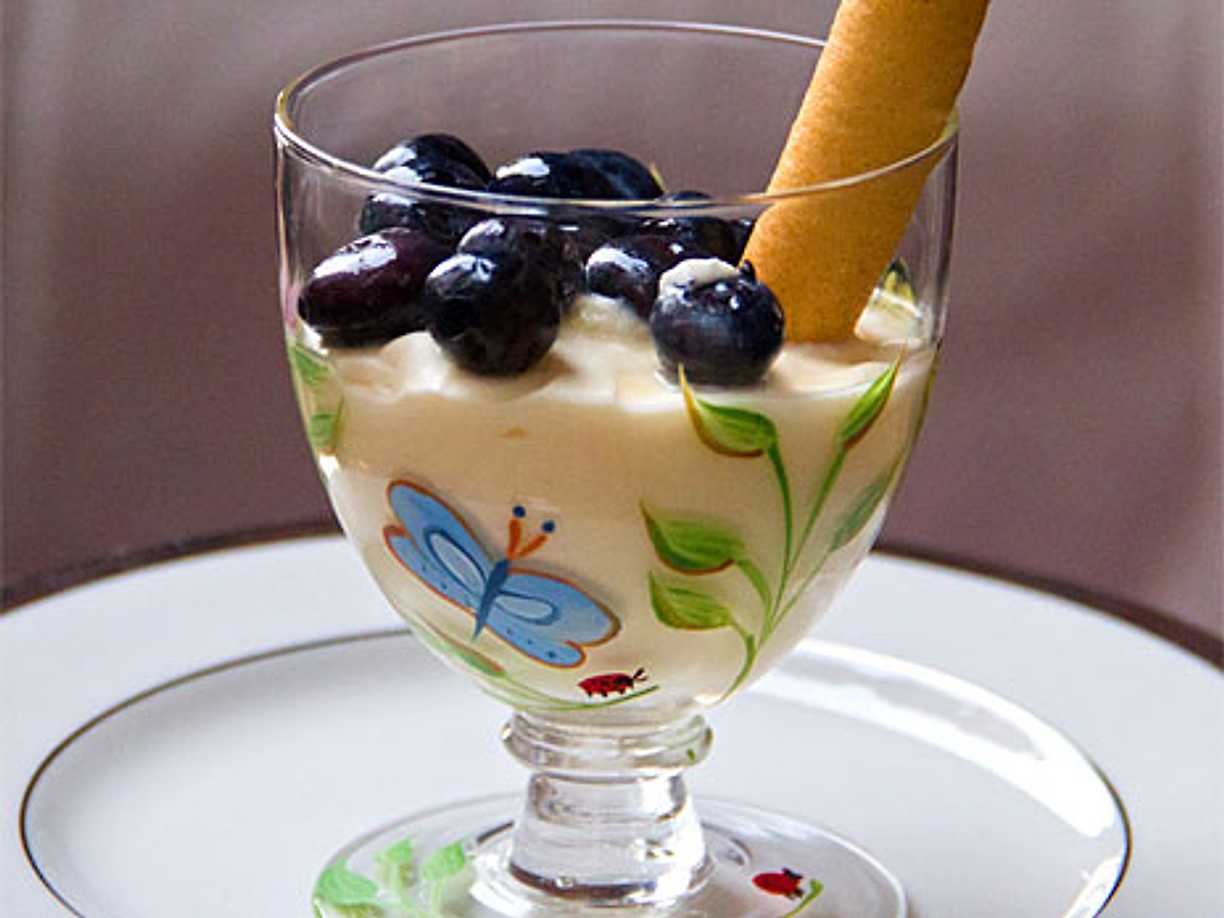 Vit chokladmousse med blåbär och kaksmulor
