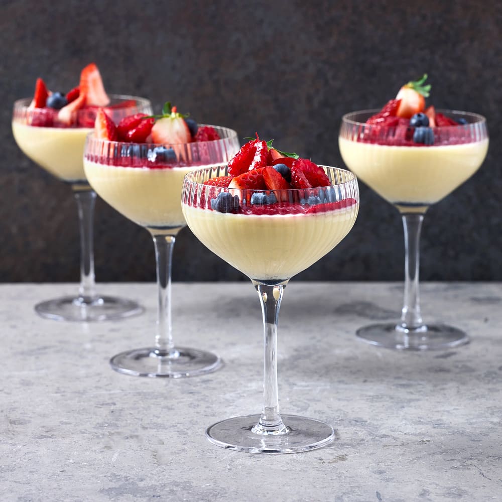 Vit chokladpannacotta med muscovadomarinerade jordgubbar