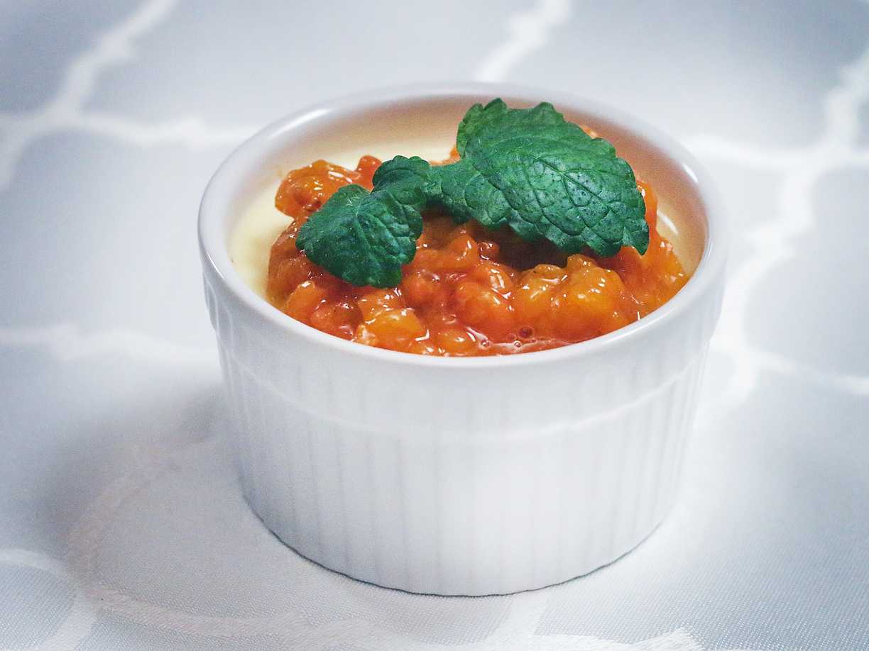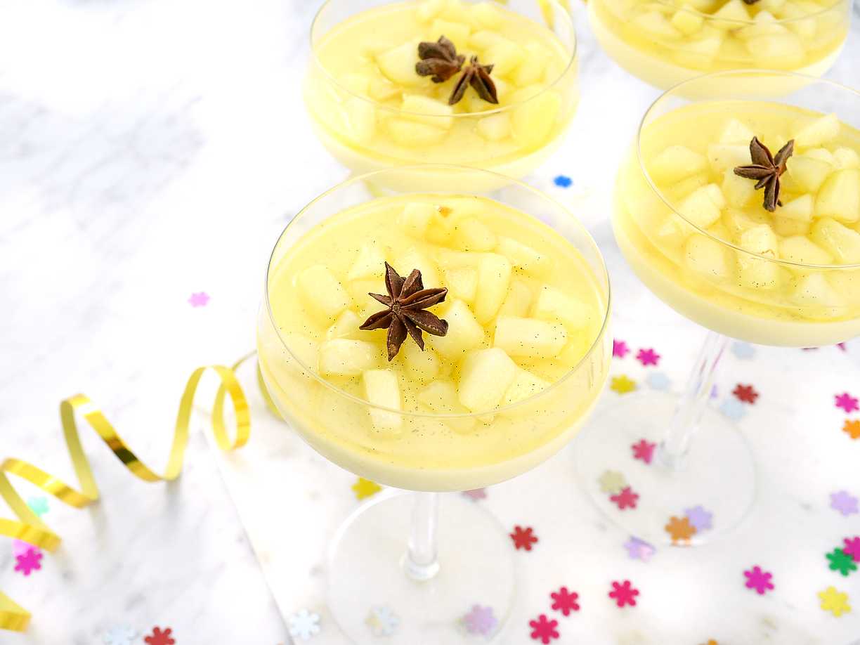 Vit chokladpannacotta med vaniljkokta vinteräpplen