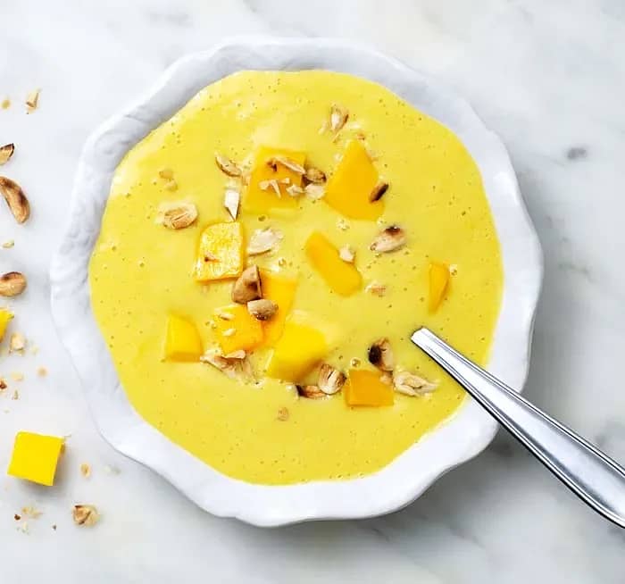 Gul solskensbowl med vita bönor, mango och gurkmeja