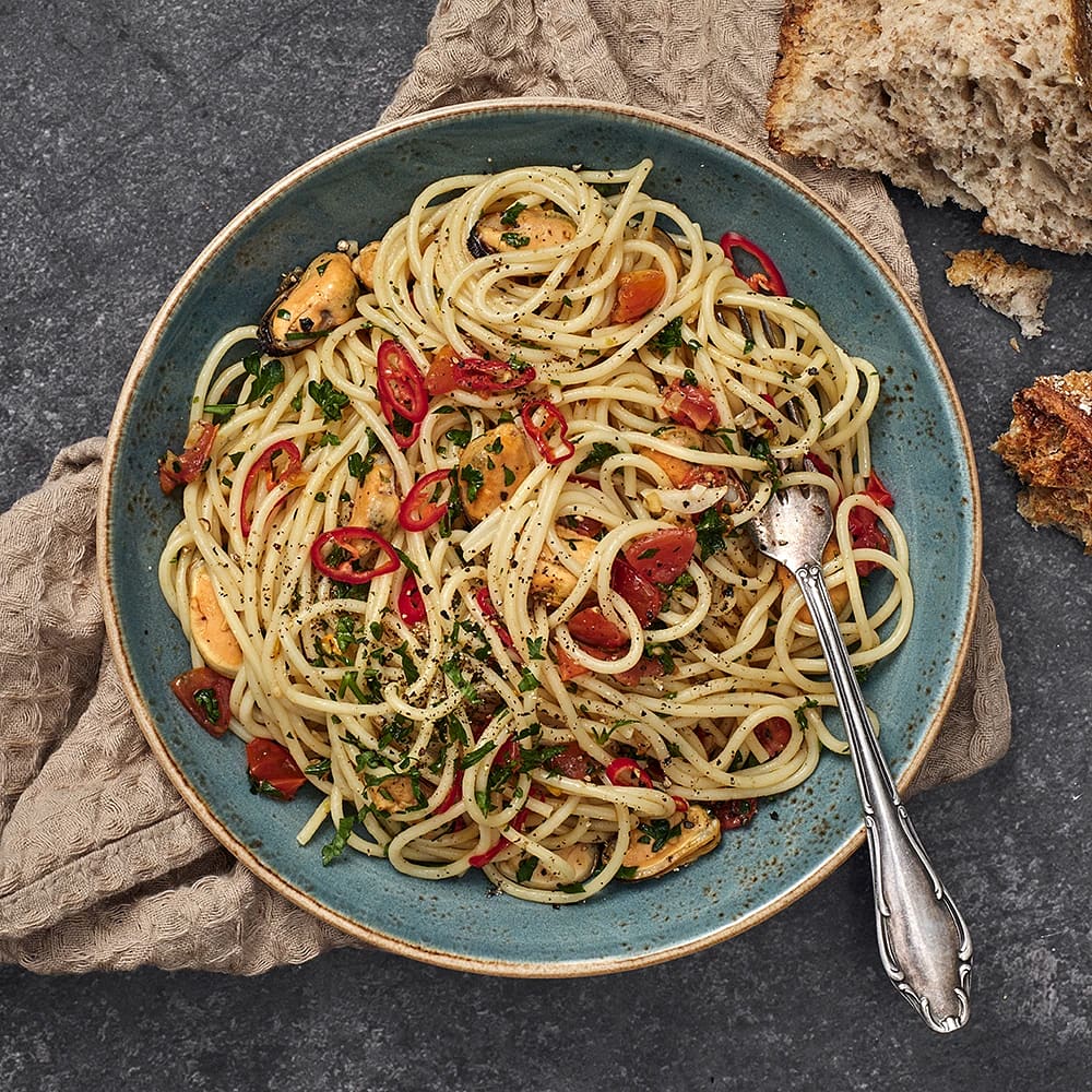 Spagetti med blåmusslor, chili och vitlök