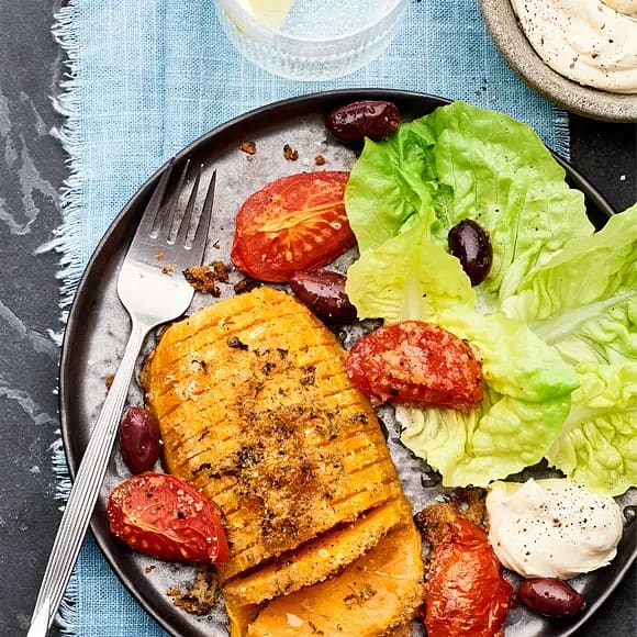 Rostade rotsaker med vitlökskräm och gröna bönor