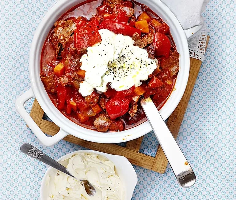 Fransk gryta med korv, lammkött och rostad vitlökskräm