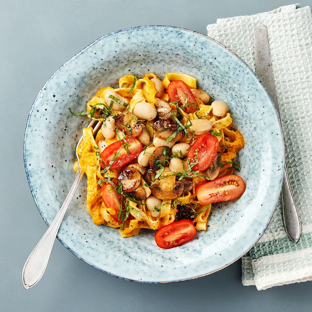 Morotspasta med vitlöksstekt svamp och basilika
