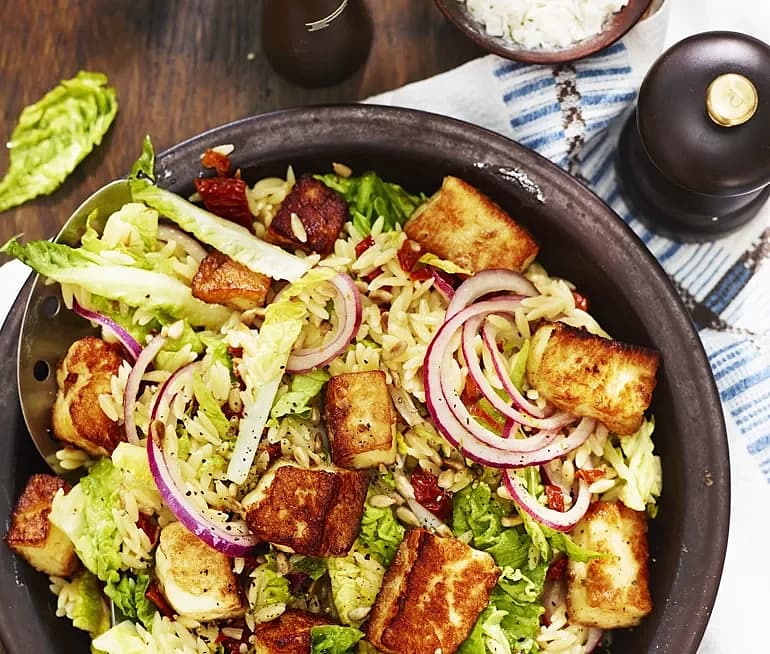 Risonisallad med vitlöksstekt halloumi