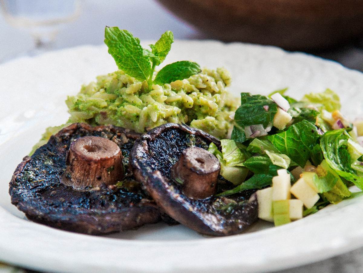 Ärtpestorisoni med vitlöksstekt portabello och passionsfruktssallad