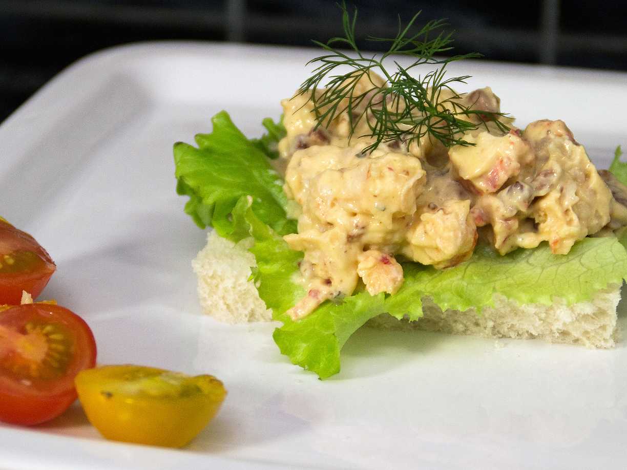 Kräft- och räkröra på vitlöksstekt bröd