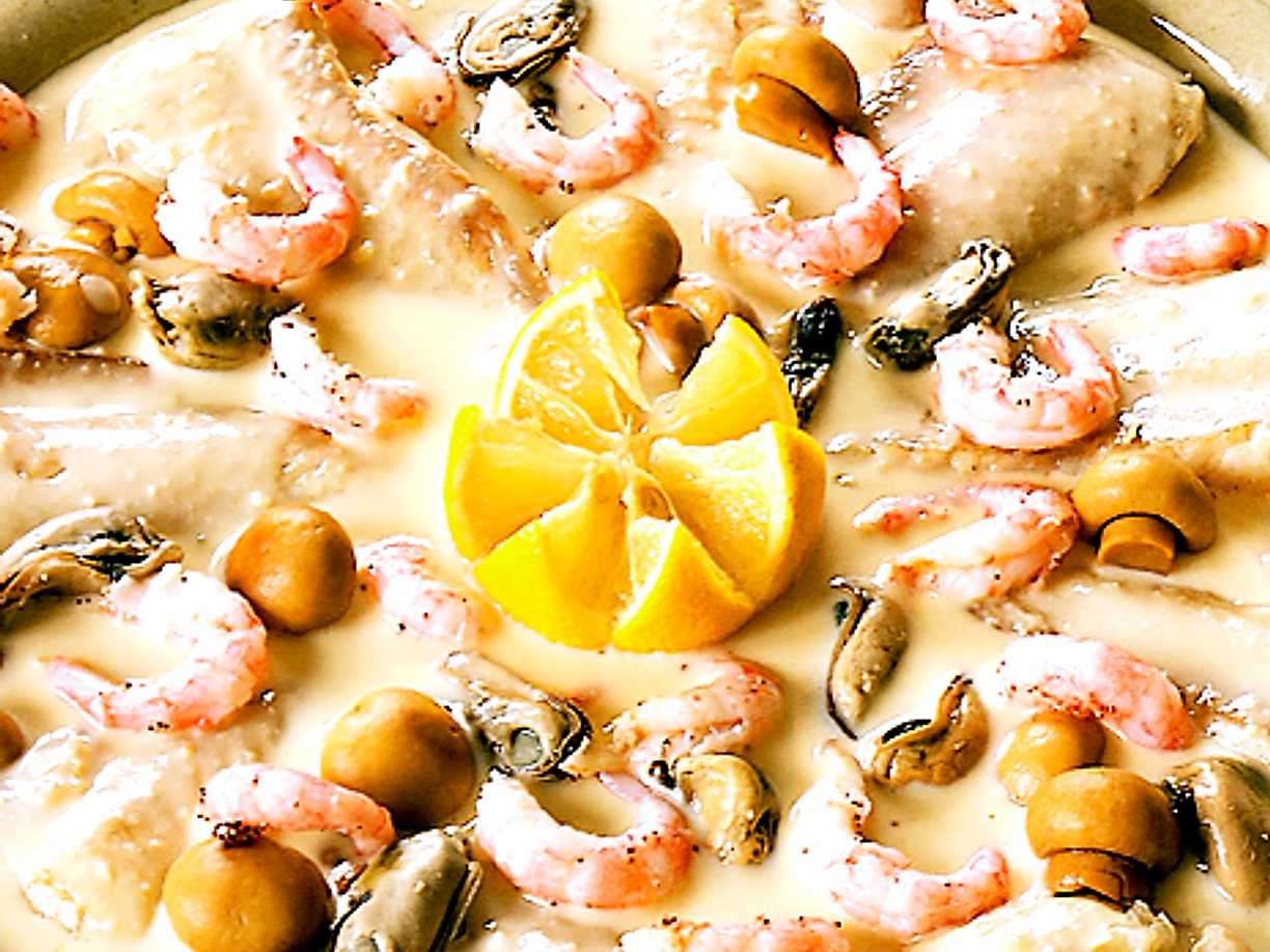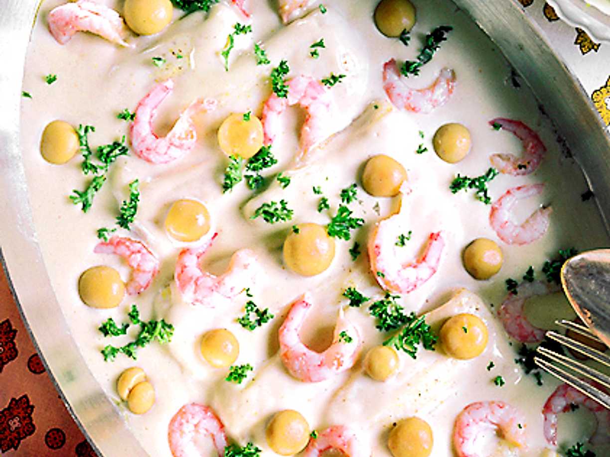 Rödtunga med vitvinsås och räkor