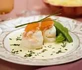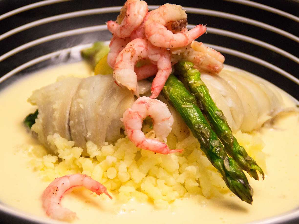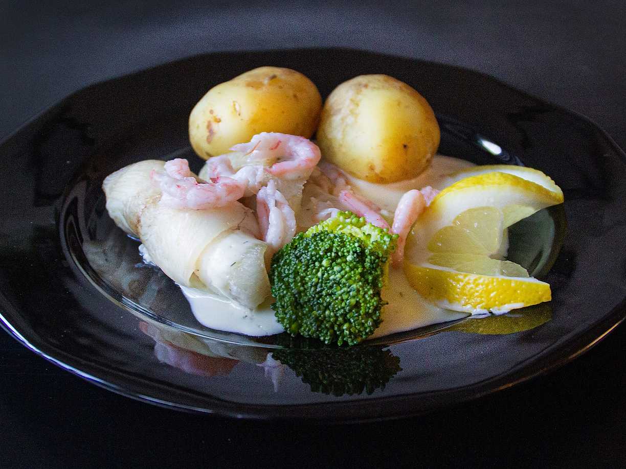 Slätvarsfilé med musslor, jätteräkor och vitvinssås