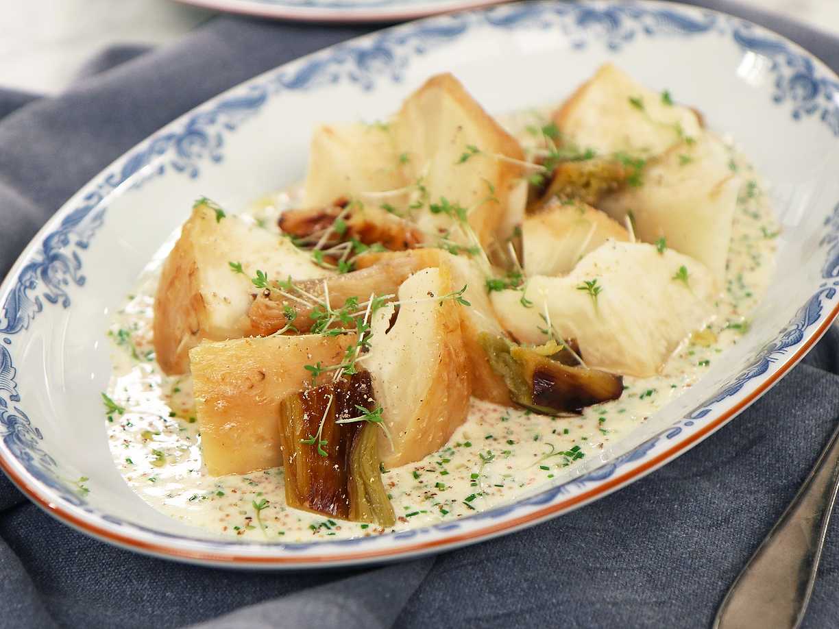 Bakad rotselleri med vitvinssås och stenbitsrom