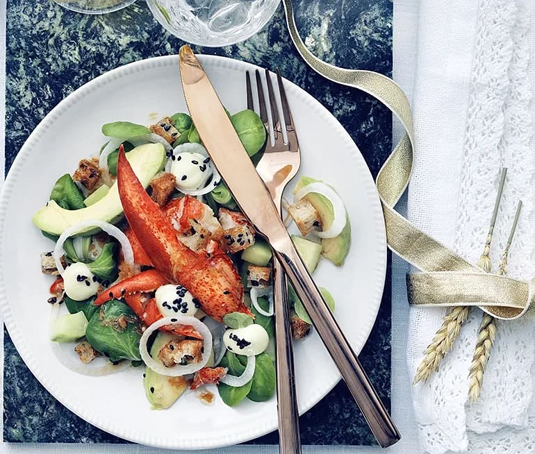 Skaldjursallad med sesamkrutonger och wasabimajonnäs